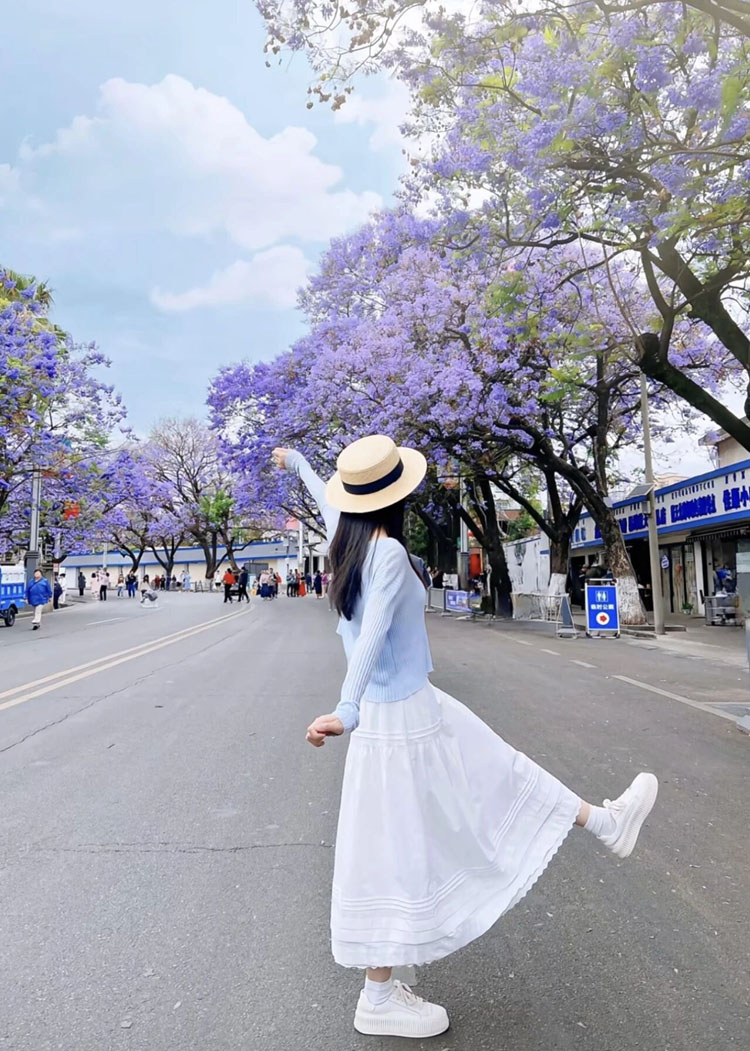 ③站在蓝花楹街对面,镜头放大三倍,拍背影。