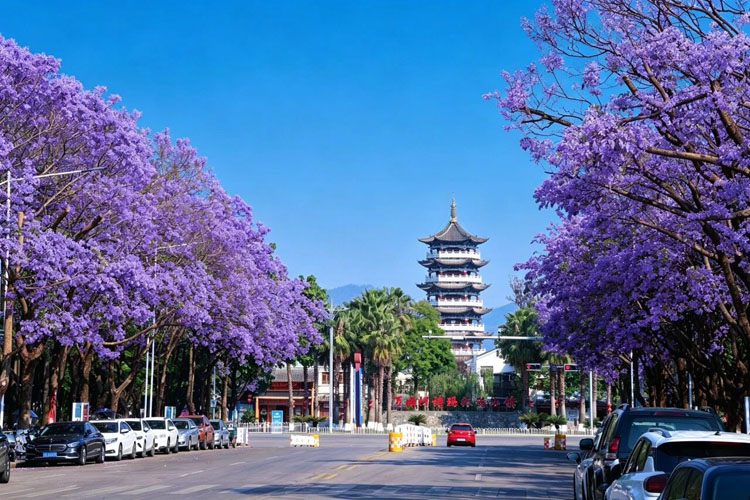 蓝花楹盛放之时,紫韵满城、诗意盎然,为石林添上一抹柔和浪漫的色彩,让自然美景与民族文化在此相融共生,成为初夏时节最具辨识度的城市风景。